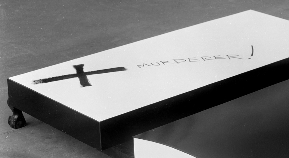 This pun-sculpture was based on the tomb beds of the nobility found in most mediaeval English churches where husband and wife lie in effigy side by side. I thought of how such people would be commemorated today. There would be a newspaper photograph with a caption saying 'The Duchess of Mecklenberg and left, the Duke of Mecklenberg'. So I wrote this on the work. This made the additional point that the duke had been 'left' as his wife had pre-deceased him.
