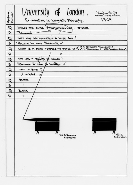 This consisted of a base made from a black lamp standard supporting a sloped lectern made from sheets of white board. On the lectern was drawn a mock examination paper in linguistic philosophy, supposedly issued by the University of London.