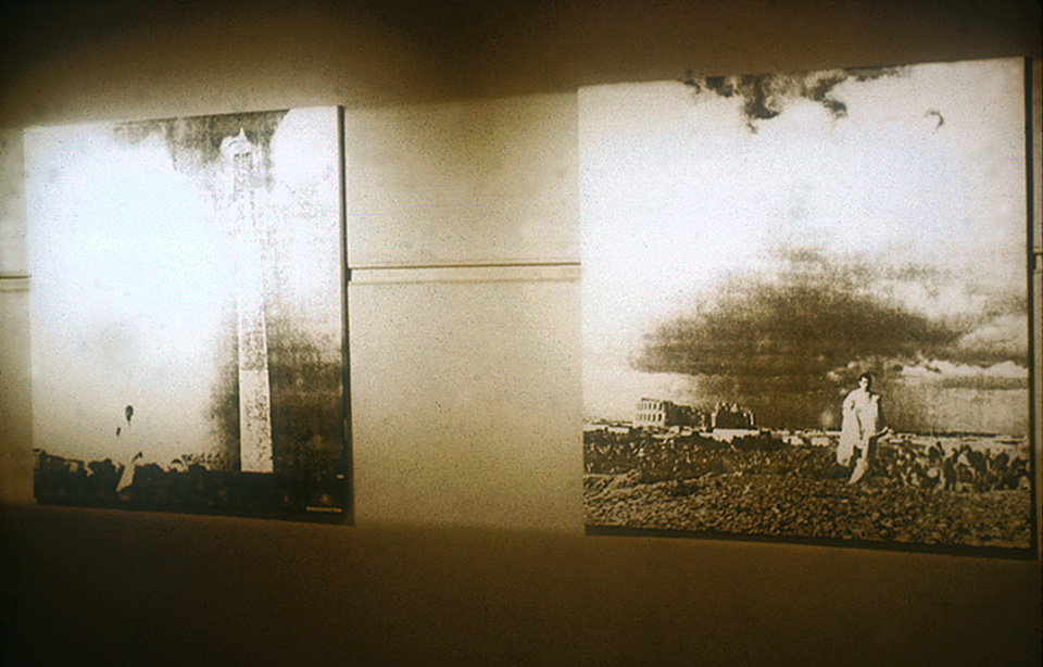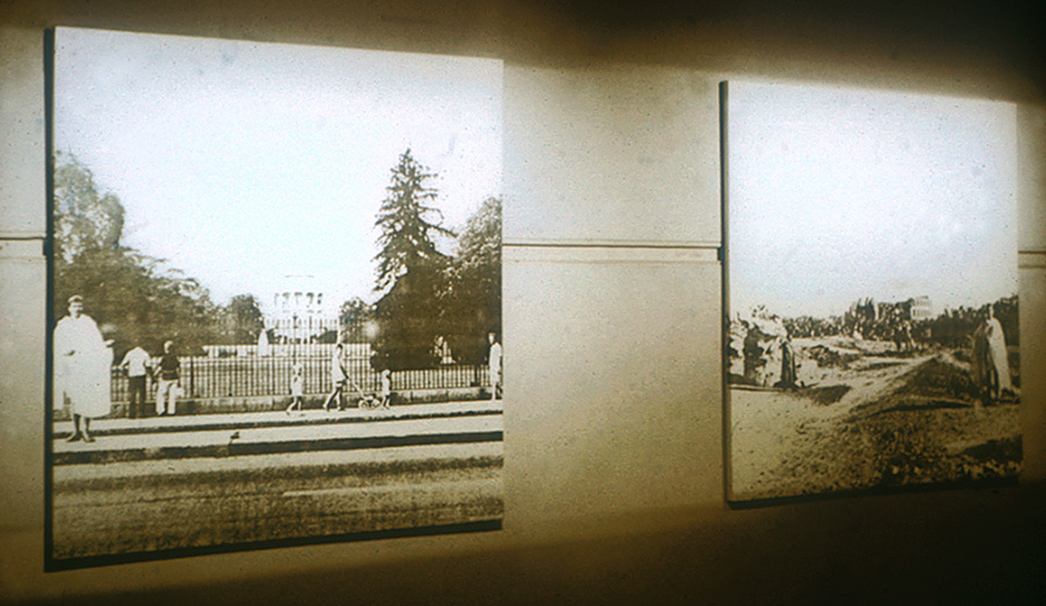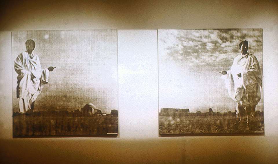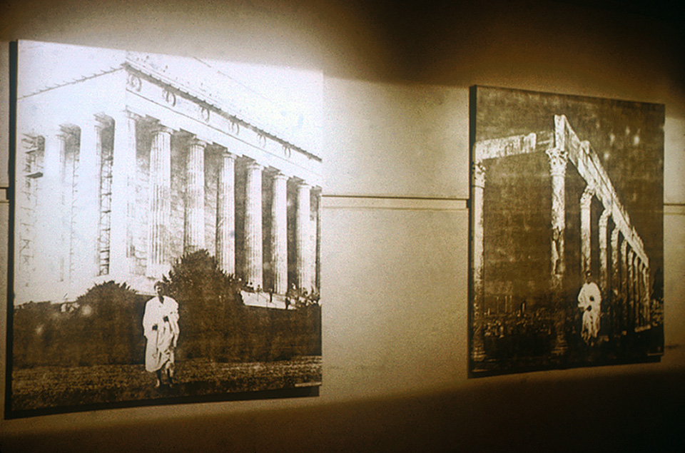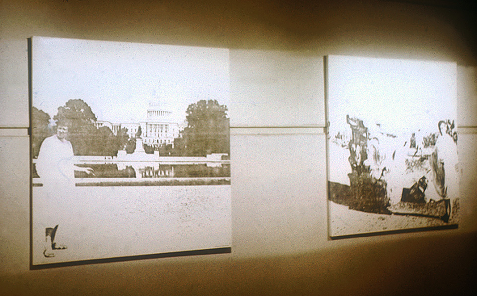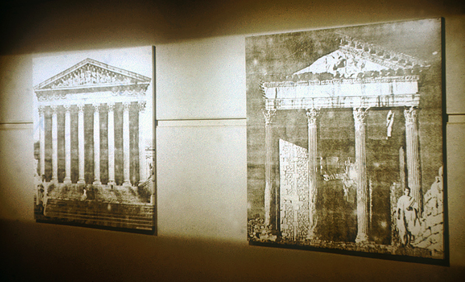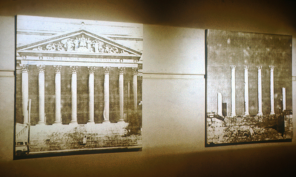 This work consists of a number of large paired panels. Each panel was covered by a photo enlargement of a photocopy of a photograph. As a result, they looked rather like charcoal drawings. The paired panels showed photographs of myself, dressed in an hotel bed sheet doubling as a Roman toga, posing in front of, on one panel, Roman style government buildings in Washington DC, and on its pair, the same style buildings, but the real thing, crumbling in the deserts of North Africa. I adopted mirror image poses in each case. I stood in the toga outside the White House, the Washington Monument, the National Archives Building (where I was asked not to photograph without written permission from the Senate for the use of a tripod), the Supreme Court (where I was threatened with arrest), the Jefferson Memorial, the Lincoln Memorial and the United States Capitol.